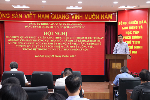 Sở Quy hoạch-Kiến trúc Hà Nội tổ chức Hội nghị phổ biến, quán triệt, triển khai đến toàn thể đảng viên, CBCCVC về Chỉ thị số 24-CT/TU ngày 07/8/2023 của Ban Thường vụ Thành ủy và Kế hoạch số 171-KH/TU ngày 14/8/2023 của Thành ủy về việc tăng cường kỷ cương, kỷ luật và trách nhiệm giải quyết công việc trong hệ thống chính trị thành phố Hà Nội